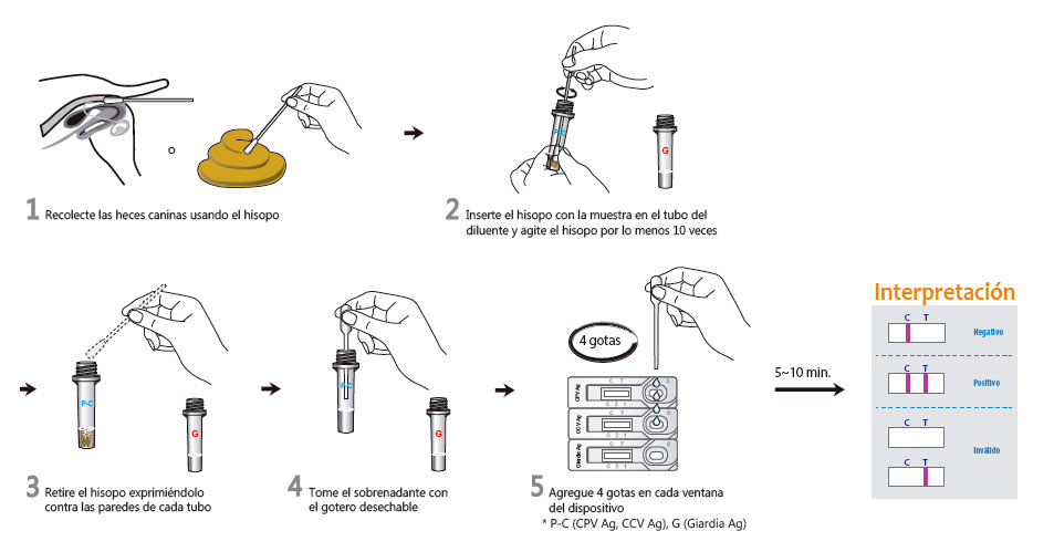 ObjetivoDetección del antígeno de Parvovirus, Coronavirus y Giardia Canino.